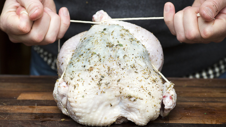 MasterClass defines trussing as a culinary technique that involves binding a whole chicken (or other bird) with twine to keep the legs and wings near the bird's body. This permits more consistent cooking, which translates to moist meat and crisped-up skin because you're essentially sculpting the bird into a more manageable form. As such, you'll also see twine come into play when making other roasts for the same reason.