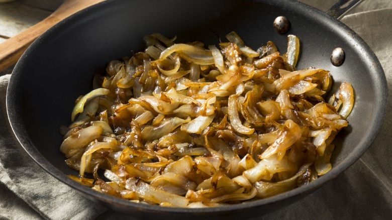 Caramelized onions pack a punch of sweet and savory flavors that go well with so many things, including bologna. If you want to step up your bologna sandwich, one way to do that is to pan-fry the bologna and top it with caramelized onions. When done the right way, fried bologna has a crispy bite and smoky flavor. The soft and melty texture of the onions pairs perfectly with the crunch of the bologna, leaving you with a mouth-watering combination you're sure to love.