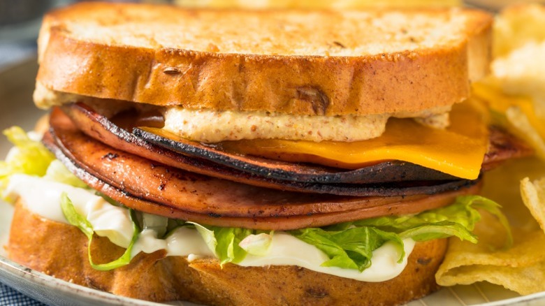 If you're going for a bit of nostalgia with your bologna sandwich, you can still choose a fluffy white bread, mild cheese, and store-bought bologna. All you really need to upgrade this childhood favorite is some spicy brown mustard smeared over each slice of bread. The mustard's pungent spice and pop of acidity help to cut the fattiness of the bologna while adding bold flavors. Also, depending on what mustard brand you use, you might add a satisfyingly gritty texture to your sandwich from the coarsely ground mustard seeds.