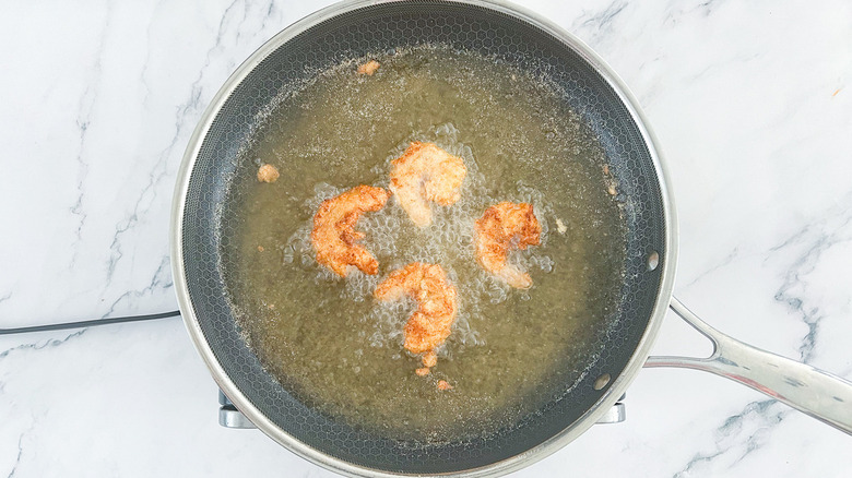 - Fry the shrimp in batches for 3 to 4 minutes per side or until golden brown.