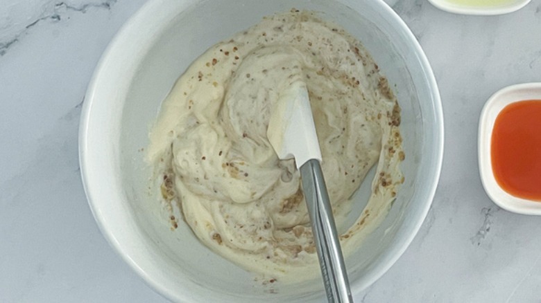 Stir the mayonnaise and mustard together, then season this mixture with 1 teaspoon paprika and ½ teaspoon of both the onion and garlic powders. Spice things up with a teaspoon of the hot sauce, or use more than a teaspoon if you like. As Johnson suggests, "If you prefer a spicier dish, add additional hot sauce." Finish things off with the pickle juice and green onions, then refrigerate the remoulade sauce (for this is what you now have) for the time being. This sauce is the one recipe component that can be made in advance as Johnson notes that it should last for up to 2 days in the refrigerator.