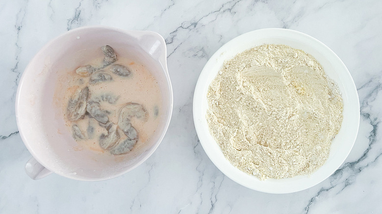 Meanwhile, you can mix the cornmeal with the flour. That way, once the 15 minutes are up, all you'll need to do is to roll the shrimp in this mixture until it's coated, then it will be all ready to fry.