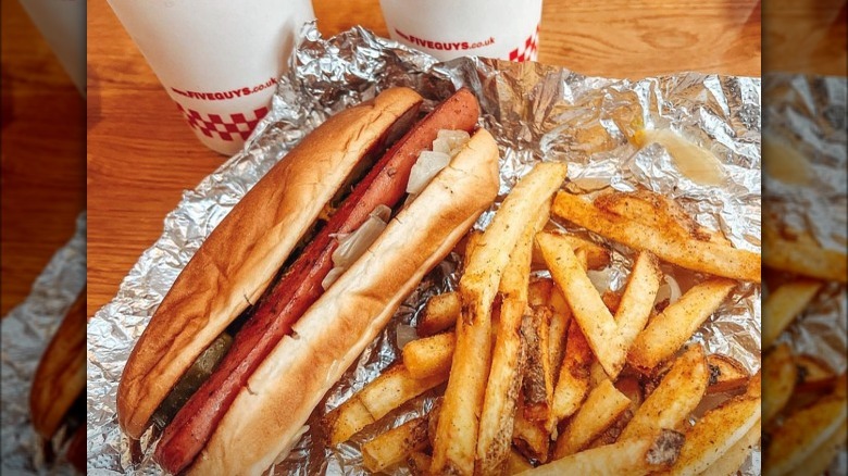 All that aside, though, no one can deny that hot dogs, even fast-food hot dogs, are pretty tasty; so long as you're not eating one every single day, they can be a part of a balanced diet. At Five Guys, you've got four hot dog options. While the most sodium-laden, carb-laden one of them all is covered in bacon and cheese, if you want to go the healthier route, opt for the regular hot dog, which only has about 500 calories. Unfortunately, the dog does come with 1,130 milligrams of sodium, so you'll want to watch your intake for the rest of the day to ensure you don't overextend your consumption, per the U.S. Food & Drug Administration's recommendations.
