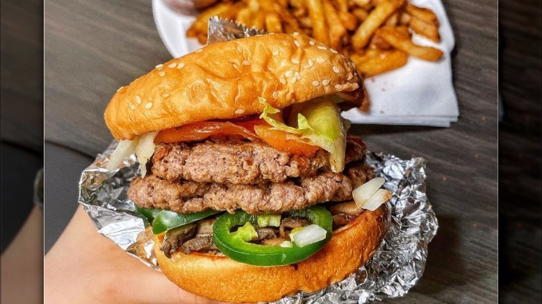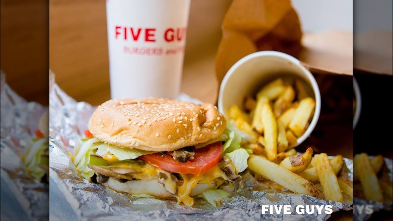 Five Guys is known for its hamburgers over everything else. You step up to the counter, place your burger order, and lay out the toppings you want, and then the cashier shouts out the number of patties to cook to your order, right then and there. While some Five Guys' burgers come stacked with multiple patties and multiple pieces of cheese, plus some bacon, that's not the case for all and, if you're looking for your overall healthiest option, you'll want to steer clear of those and just go with the Little Hamburger.