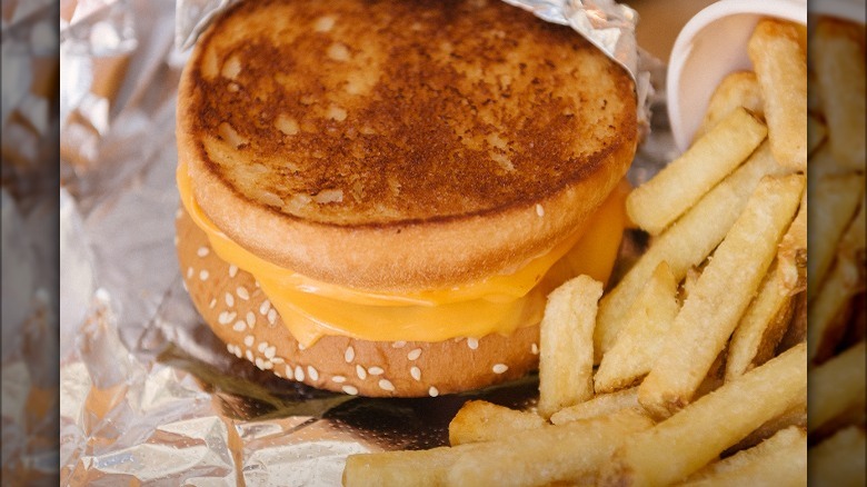 While, among Five Guys' sandwiches, the veggie sandwich may boast the least overall fat content, that sandwich does come with more than a thousand milligrams of sodium and 60 carbs, making it potentially bad news if you're trying to cut down on either of those. If that's the case, opt instead for the grilled cheese, which also comes on a bun and with toppings (if you so desire), but a base of American cheese. The sandwich contains the least carbs and the least sodium of all the Five Guys sandwich options, at 41 grams and 715 milligrams, respectively.