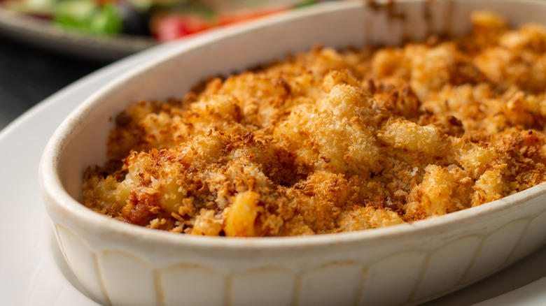 Everyone loves a crispy crust on a casserole, and the mouthwatering effect is easy to achieve by baking your pasta with a special topping. First, make sure that your noodles are in an oven-friendly baking dish. Then, sauce them up however you like, such as with melty cheeses, jarred or homemade tomato sauce, or alfredo. Then add the final topping — you want something that will crisp up and turn golden and crunchy in the oven, such as breadcrumbs, panko, crushed Ritz crackers or saltines, or even nuts. For added flavor, mix in some shredded or grated cheese.