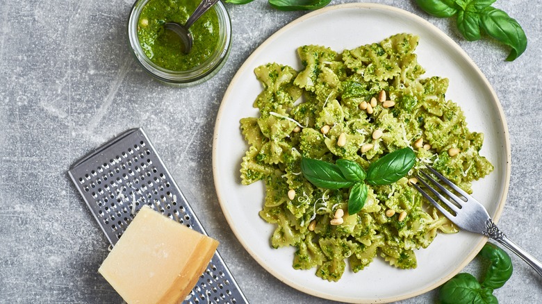 You'll also need fresh garlic. If you're making your own pesto, choose plump, white cloves that are blemish-free and have not sprouted. The other essential pesto ingredients are good-quality olive oil (preferably from Italy), pine nuts, and cheese. The exact type of cheese you use can vary, as some insist that Parmesan is the only way to make true pesto, and other chefs turn instead to the less-salty pecorino Romano (which is also more budget-friendly). Finally, to season your sauce to your liking, add a good pinch of kosher or sea salt.