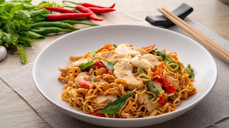 If it's a chilly night and you're looking for a meal to cozy up with, a bowl of noodles can quickly be transformed into an entirely different dish, such as a warm bowl of soup, with a few simple additions. And while the classic chicken noodle soup is always an option, noodles will work in more than just broth-based dishes. For example, stir orzo or bowties into a creamy puree of butternut squash or sweet potato soup. Or, go with the familiar pairing of pasta and tomato by adding noodles to canned or homemade tomato soup. If you'd rather go with store-bought soup, anything that doesn't already have noodles, rice, or potatoes in it will benefit from the addition.