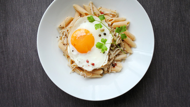 If you need a reason to top your noodles with a sunny-side-up egg, consider that the egg is a nutritional powerhouse, per WebMD. It contains protein, fat, and essential vitamins and minerals your body needs to thrive. And if you fry it up just right, so the yolk remains a little jammy, it will act as a built-in sauce to coat your pasta in its luscious, savory goodness. This is a signature of the Italian pasta dish spaghetti carbonara, which is served with a whole egg yolk on top, ready to be mixed into the noodles to enrich the dish.