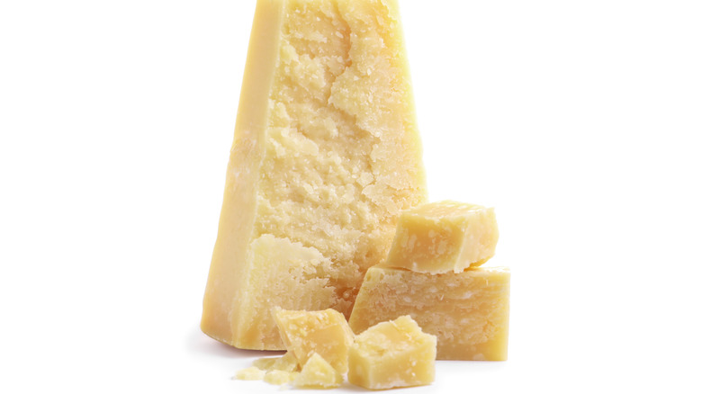 In the case of Parmesan, for example, the cheese starts out as cow's milk that has had the fat removed, called "skimmed." Specific cheese-making bacteria are then added and the mixture is heated until it curdles. After being strained, the cheese curds are set into large round molds, called wheels, and brined in salt. As the cheese hangs out in its salt bath for a good three weeks, it takes on its signature saltiness. Then, the final step is to let the cheese wheels age for at least a year and often longer in a cool, dark environment. As the cheese ages, water evaporates and the flavor becomes increasingly concentrated and savory, making it the ideal topping for plain pasta.