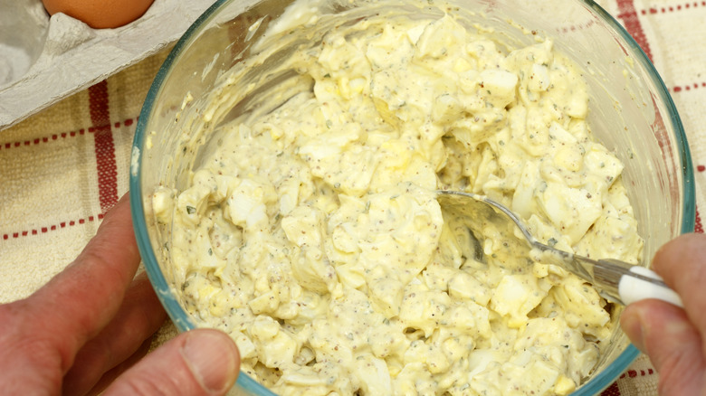 When preparing egg salad to pair with an English muffin, you can stick with a standard recipe with hard-boiled eggs, mayonnaise, mustard, dill pickles, salt and pepper. Alternatively, you could try using a few more upgraded additions, such as imitation crab meat, chopped onions, bacon, or avocado.