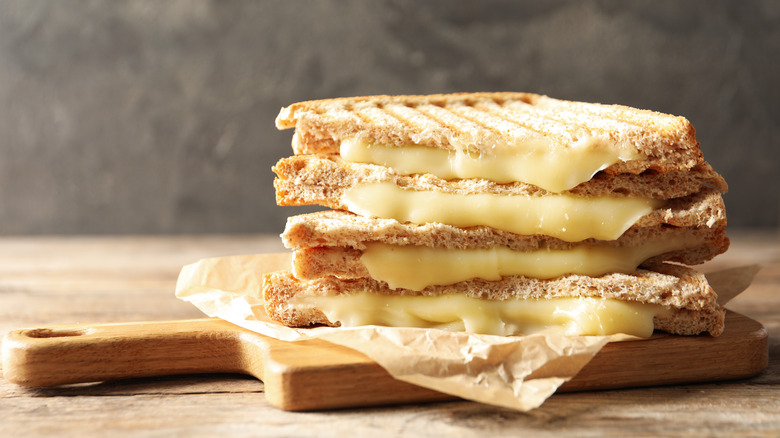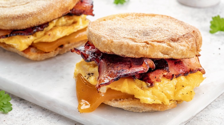 In addition to choosing the perfect bread — or in this case, English muffin — for your sandwich, there is one other important decision to make: What type of cheese you'll use. Traditional cheddar or American are always safe bets. However, if you want something a little more exciting, try Gouda, brie, provolone, or even blue cheese. A few other tips to make an English muffin grilled cheese even better include adding tomato, ham, bacon, or mushrooms to the mix. Don't forget to cook the sandwich over medium heat to get each side nice and golden brown. You could also try using an air fryer to cook the sandwich evenly from both sides at the same time.