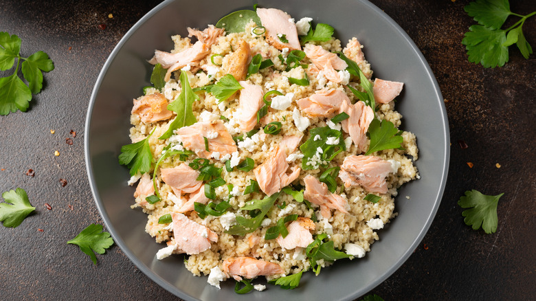 Like pasta, rice and grains make an excellent complement for just about anything. They're also readily available and inexpensive. Adding salmon provides a lean protein boost to an already-filling meal. Building a grain bowl is simple and can be customized to suit anyone's tastes.