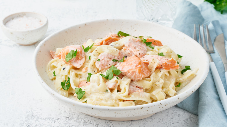 Canned salmon gives some extra taste to your pasta and makes it more filling by adding protein. And you'd be wrong if you think this only means making dishes like old-school tuna casserole. Consider adding it to fettuccine alfredo or mixing it into your next pasta puttanesca.