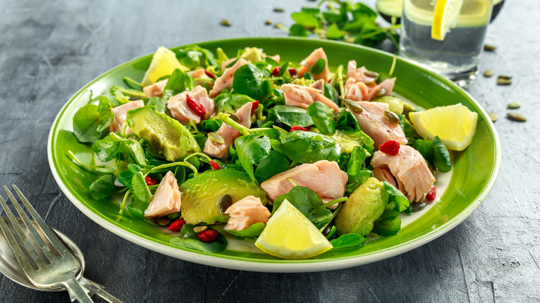 Turning your canned salmon into a tuna-like concoction for sandwiches isn't the only way to turn it into a salad. Consider adding it to Caesar, Greek, Cobb, or even simple tossed salads. Like your grain bowls, adding salmon to your salads gives them a protein boost. If you add it to a Cobb salad, you get double the benefits since this type of salad also contains eggs.