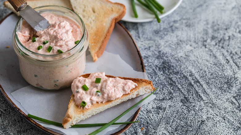 It's served on rye bread, and the filling is made not just of salmon, but also cream cheese and sour cream for a delightfully spreadable sandwich topping. Start by mixing the cream cheese and sour cream, then add lemon zest, salt, pepper, and, if desired, hot sauce. Next, slice up a bulb of fennel or celery, and add to the cream cheese mixture with diced roasted red peppers and chopped chives. Add the smoked and canned salmon, mix, and then refrigerate for up to four days. When you're ready to serve, spread butter on your bread, then add the salmon-cream cheese mixture.