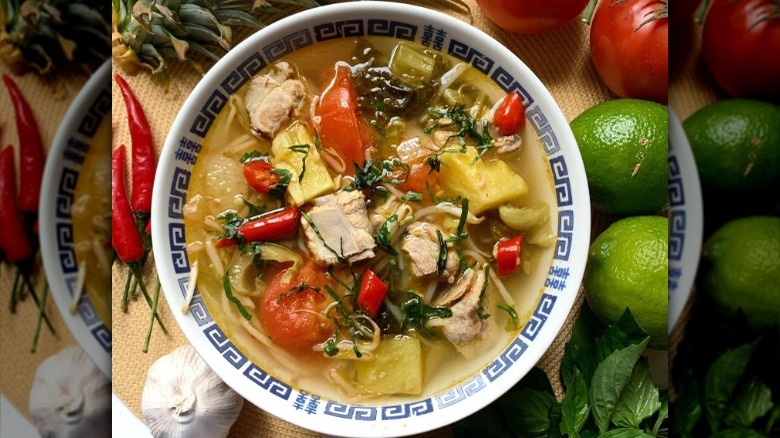 Canh chua is a Vietnamese sweet and sour soup that perfectly blends a variety of flavors together. The dish hails from the Mekong Delta. It may be surprising to some people to see a soup with pineapple in it, but it works really well. Traditionally, canh chua is made with fish, tomatoes, and pineapple and uses a tamarind base, which helps to give the soup its complimentary sour notes. Both tomatoes and pineapple work together well canh chua as, on their own, the fruits are both sweet and tangy.