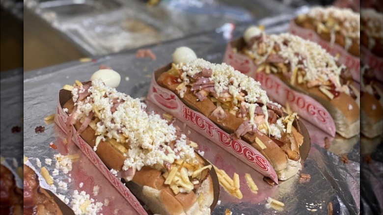 Perro caliente is a hot dog, but it's not just any hot dog — it's the loaded hot dog to end all other hot dogs. Perro caliente is a Colombian street food that starts with a boiled hot dog. The hot dog is then topped with crumbled potato chips, garlic mayo, salsa rosada, and a pineapple sauce. Sometimes it even gets an additional topping of quail eggs. The result is an indulgent, filling food that is salty, sweet, and crunchy all at the same time.