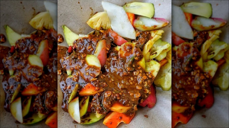A good example of this is rujak. Rujak (also spelled "rojak") is a fruit salad found in Indonesia as well as Malaysia and Singapore. In all of its regional varieties, rujak is served with a dark and sticky sauce and topped with peanuts.