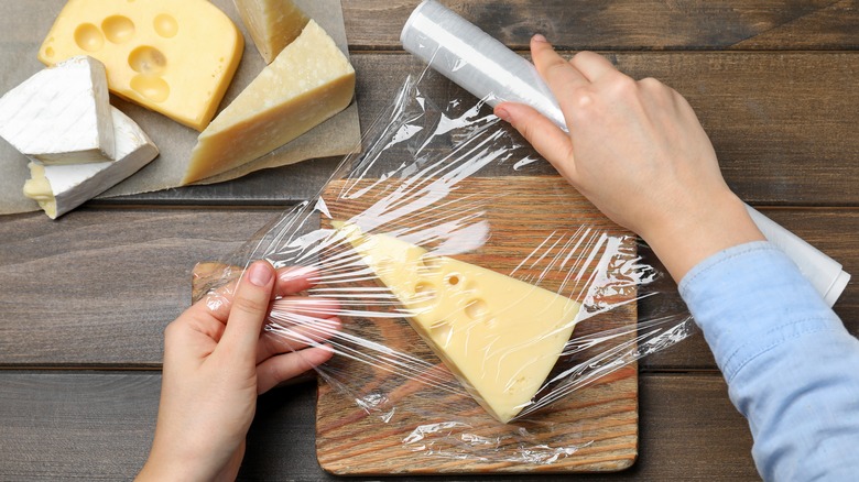 If there's one food you should stop wrapping in plastic, it's cheese. This seems counterintuitive, of course, since so many cheeses come from the store wrapped in plastic. But it can very negatively affect your cheese. First, consider that this already breaks one of the first rules we've discussed: don't let your plastic wrap touch the item you're wrapping. Since plastic wrap will cling to the surface of your cheese, there is a higher likelihood of chemicals leaching into it. It can also leave your cheese with a plastic flavor. But those aren't the only reasons.