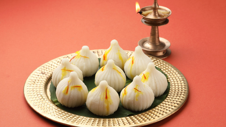 Modak, according to legends, are a favorite food of the Hindu god Ganesha. The god of wisdom and intellect, Ganesha is said to be able to offer protection and help people get past life's obstacles. He's widely worshipped in India, and people often make modak to offer to Ganesha at temples during religious festivals. Popular ones are Sankashti Chaturthi, an auspicious day that happens every month, and Ganesh Chaturthi, a 10-day festival around August and September of each year.