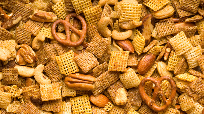 If you've ever made Chex Mix at home you know it's an incredible vehicle for garlic powder. A half teaspoon is enough to provide garlicky goodness to eight cups of cereal, and nuts. Chex Mix recipes call for the spices to be mixed into the melted butter and Worcestershire sauce to ensure an even coating of flavor. But there's another (often) overlooked reason why this step is crucial.