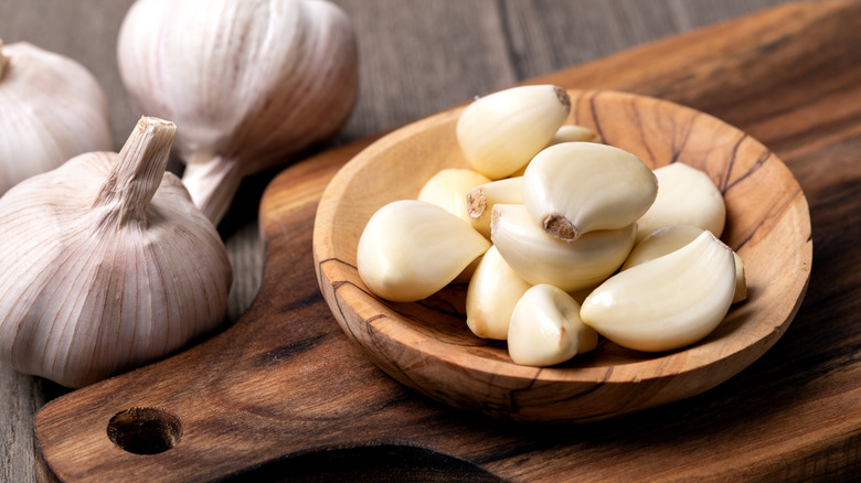 Unless you buy pre-minced garlic, your food prep may involve peeling cloves of garlic for your recipe. Although garlic skin isn't technically dangerous to eat, it can have an unpleasantly tough texture — not necessarily something you want when using garlic primarily as seasoning in your dishes. (You can save the skin for later use in stocks, strained sauces, or even grinding it up to use on garlic bread.)