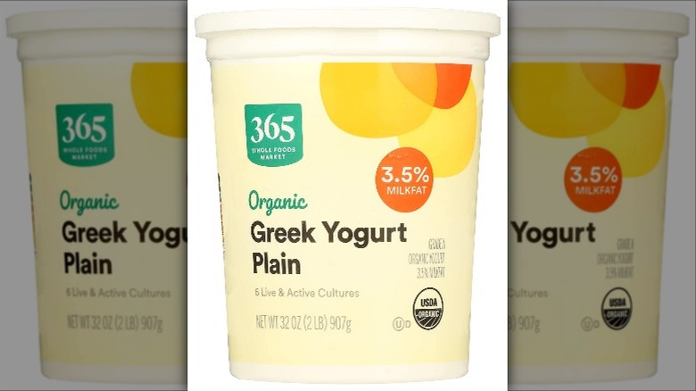 365 by Whole Foods Market is an organic and non-GMO brand of Greek yogurt. It has only 5 grams of sugar without additives. This protein-rich brand provides 16 grams per serving, equivalent to 32% of your dietary needs. Whole milk 365 Greek yogurt contains 6 grams of fat and 25 milligrams of cholesterol. The brand uses milk from cows that haven't been treated with the growth hormone rBST. It has 0 grams of total fat and only 5 milligrams of cholesterol. This yogurt also provides calcium and vitamin D to keep your bones healthy and strong, and is gluten-free and kosher-certified.