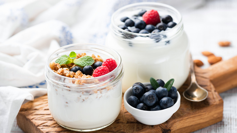 Greek and regular yogurt are milk fermentation products with different consistencies, tastes, and nutrient profiles. The straining process for making Greek yogurt removes most of its liquid components as well as the milk sugar. What's left is a thicker, creamier mixture that contains nearly twice as much protein as regular yogurt. According to Medical News Today, Greek yogurt is protein-rich and supports muscle growth. It has probiotics that may help protect gut health, contributing to your overall well-being. You get calcium too, a crucial nutrient for bone health.