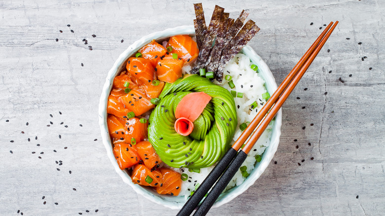 It doesn't end there. Several other toppings can make your poke bowl extra tasty, like seaweed and shaved onions. Chef Dakota Weiss recommends avocado, highlighting how it offers a nice creaminess to the dish. Avocado is an excellent topping that adds dimension, nutrients, and flavor. Weiss goes on to tell People that "people go bonkers for our crispy onion," giving another example of a perfect addition to your bowl. With so many ways to personalize your next poke dish, there's no reason to waste time on the watery veggies — skip right to the winners.