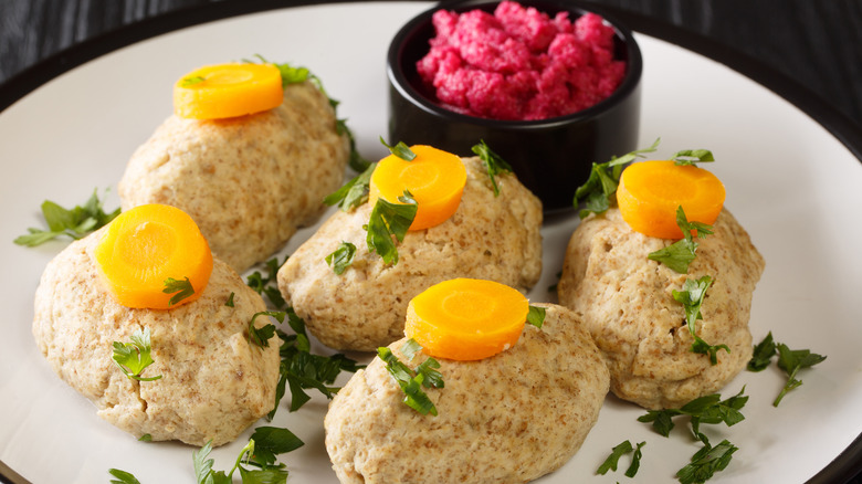 Gefilte fish is a ground seafood dish made of carp, pike, or other whitefish. During preparation, the food is shaped into oblong patties and poached. This dish is often served during Passover Seder.
