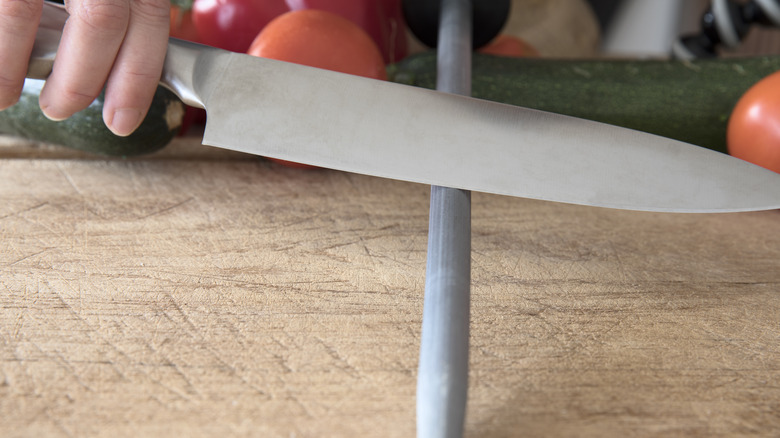 That steel rod that comes with your countertop knife set is actually not going to sharpen — its job is to hone. The edge of the blade has microscopic burrs that, when sharp, stand up straight. With use, the burrs bend either left and right. Running the blade against the honing rod will bring them back into a straight formation and keep you slicing and dicing with a clean edge in between sharpenings. Not only is a sharp knife safer, it makes chopping a heck of a lot easier on you.