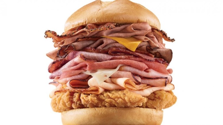 Arby's Meat Mountain is stacked sky high with roast beef, bacon, brisket, chicken tenders, corned beef, ham, and turkey — oh and a few cheese slices in there for good measure, but who can really taste that amid the pile of hot meats? The Meat Mountain truly has to be seen to be believed, but beyond giving it a look we don't recommend touching it with a four-foot pole.