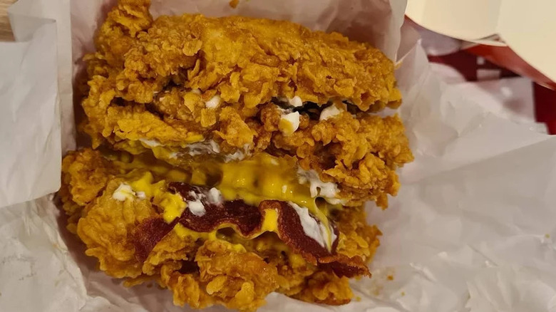 This sandwich is basically a Big Mac made out of Double Downs. This means you have a chicken breast, a layer of sauce, bacon, and cheese, followed by another chicken layer and another cheesy bacon layer before you top the whole thing off with a third chicken breast. Apparently, you can also order it as a Double Down with an extra filet. Regardless of how you try and order it, we recommend you stick to the Double Down. Seriously, have you tried the Double Down? If you can seriously walk out after eating of one of those wanting more, just down some coleslaw and at least get some cabbage in your system.