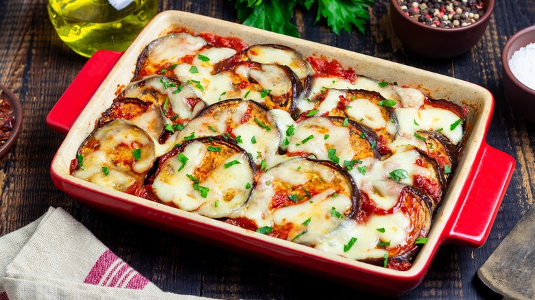 To make baked eggplant parmesan, bread some eggplant slices and layer them in a casserole dish with tomato sauce, mozzarella, and garlic. While this recipe does involve several steps, the good news is that you can make several nights' worth of food in just one pot. Rather than preparing a single round of eggplant parm, go ahead and make way more than what you need. You can serve this casserole meal two days in a row. Or, alternatively, you can make several trays of this dish all at once, freeze however much you don't want to eat, and defrost each portion in the coming weeks as needed.