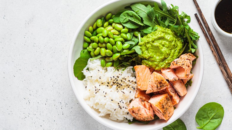 If, however, you're in the mood for raw fish, you can also try making a salmon and shrimp poké bowl. For this recipe, you'll need a super fresh cut of salmon, some pre-cooked shrimp, and whatever other veggies tickle your fancy. Assemble all of the elements into a single bowl and top with a bit of soy sauce. The entire process from start to finish, shouldn't take more than 40 minutes.
