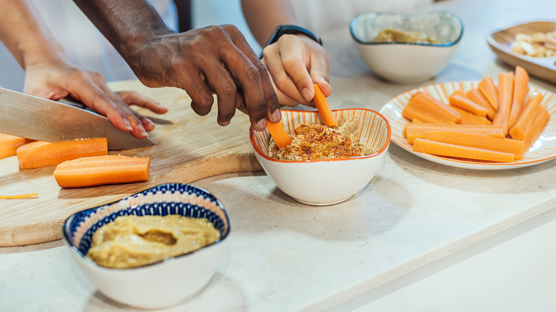 As the authors of the award-winning cookbook "Zahav," Michael Solomonov and Steven Cook know a thing or two about cooking. When it comes to weeknight dinners, the pair suggests preparing a round of hummus to use as a base; then, they say to add in some extra ingredients to dress your creation up. As Solomonov and Cook wrote in their cookbook "Israeli Soul" (via NBC), you can turn hummus from a fun snack to a full meal by adding some exciting toppings. "A plate of hummus with apricots and pine nuts doesn't need more than a couple of ounces of ground beef seasoned with Turkish coffee to make a convincing dinner," they wrote.