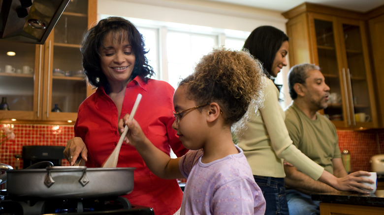 Some ways to incorporate kids into the cooking process include simple things, like inviting them to participate in grocery shopping. Children can also help out with activities like prep work, mixing ingredients, and plating. According to Lakshimi, some of the tasks that have worked well in her household are, "Washing the lettuce for a salad, chopping vegetables (if they're old enough to handle a knife), shelling peas, peeling potatoes, ripping the fresh herbs, [and] stirring the soup." Regardless of the chore that parents choose, they will be allowing the kids to become more accountable for their meals. "Give them a part of the meal for which they can be responsible," Lakshimi said.
