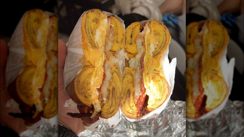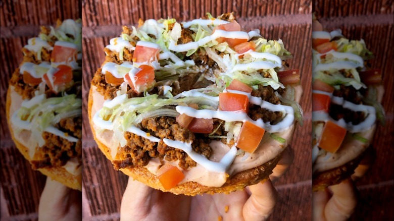 The Doritos bagel has the Doritos of your choice crushed down and kneaded into the dough, but it also can be topped with extra Doritos. Because Doritos are often a viable side to a bagel sandwich, it only makes sense that the best use for the Doritos bagel would be as the bread for a sandwich. You can take whatever sandwich toppings you love, like turkey, cheese, and lettuce, and make a delicious bagel sandwich. However, they work well with regular cream cheese, too. Here it is shown with an even more eccentric styling of a taco bagel, with meat, cheese, lettuce, tomatoes, and a sour cream drizzle, making it resemble a Taco Bell Doritos Locos taco. Here, instead of a taco shell, the pillowy goodness of bagel bread is the vessel for the delicious filling.