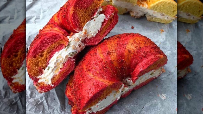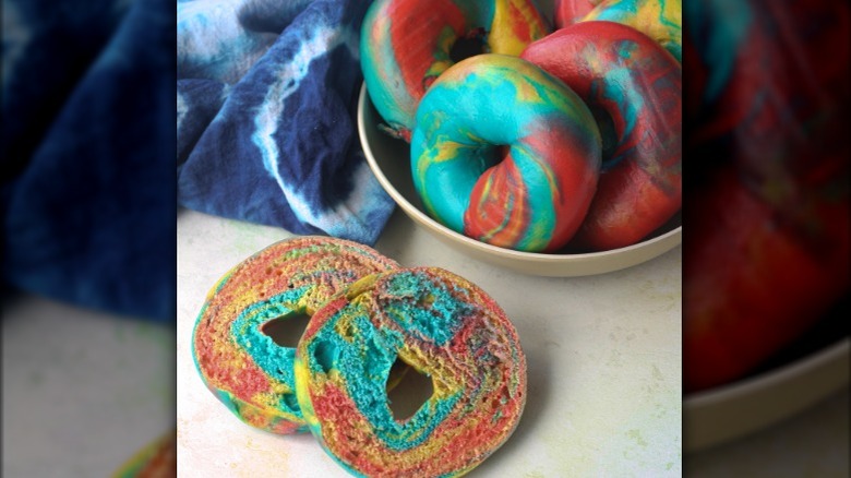 The bagel dough is separated and stained with different colors, and then combined together haphazardly to make a multicolored dough ball. One Twitter user posted about their bagel, saying, "I know it's been like 12 hours but I can't stop thinking about my tie dye bagel still." The Bagel Nook in New Jersey offers a tie dye bagel, but there are many other places to find it or ways to make your own since you ultimately just need bagel dough and food coloring.