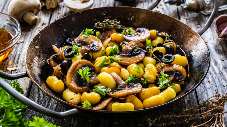 Boiling frozen gnocchi will not only make it gummy, but it can wash out its flavor, too. However, it's still a necessary process when making homemade gnocchi, as the steaming water helps to make it firm. But once the gnocchi has floated to the top, it's best practice to give it a good ol' pan-fried butter bath. It's important to remember that gnocchi is extremely versatile. So, if you want to jazz up your frozen or shelf-stable gnocchi, add some creamy sauce, veggies, and protein, or serve it with garlic and parmesan. Godere!