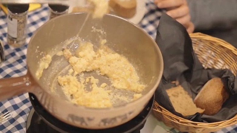 To enjoy la religieuse, wait for the fondue pot to cool. At this point, the bottom layer hardens even more. It can then easily be removed from the pot with a knife, broken into pieces, and shared between guests. Alternatively, an egg can be cracked into the fondue pot and mixed with la religieuse. This egg dish is another popular way that some like to eat this hard cheese layer.