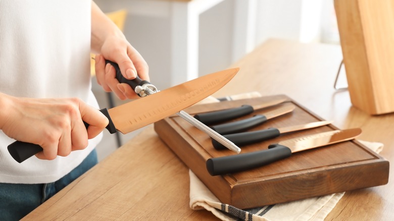 Knife infomercials have everyone dreaming of slicing through a tomato without hassle — and that collection of dull knives sitting somewhere in a knife block at home is enough for many to give in to the temptation of a new shiny set of knives. It's easy to want to trade in any set of knives that's making life harder in the kitchen. But by learning the basics of knife sharpening and implementing one chef's storage hack, your knives will be at their best in no time.