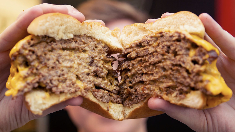 Sometimes, you just want to go all-out with your food. And while that's definitely understandable, it's possible to go a little too far sometimes. We'd say that Steak 'n Shake's 7x7 Steakburger is a good example of this. This towering creation piles seven burger patties and seven slices of American cheese between two burger buns and plates it up. You'll need to unhinge your jaw to get through this one, folks.