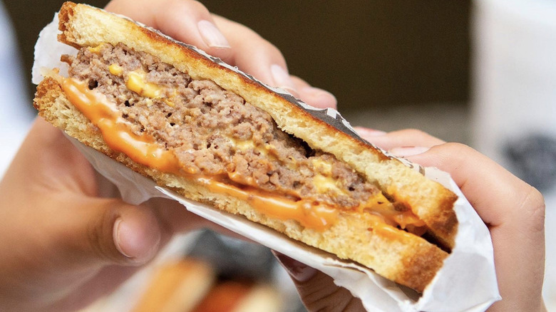 The Steak 'n Shake Frisco Melt is a sandwich with a difference. Instead of sandwiching delicate fillings like lettuce or tomato between the bread, Steak 'n Shake goes all out, cramming two burger patties and cheese slices in between two slices of sourdough toast.