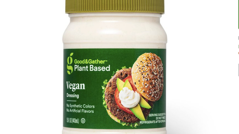 Target's Good & Gather brand has been around since 2019. According to a brand press release from that year, Good & Gather products don't use artificial flavors, synthetic colors, sweeteners, or high fructose corn syrup. The brand markets its products for families with little time to cook meals at home. Technically, this vegan mayo is a vegan dressing. The brand describes it this way: "Vegan dressing offers creamy texture with mild lemon and mustard notes." Like others on this list, this vegan dressing is certified kosher, and it doesn't contain soy, gluten, or nuts.
