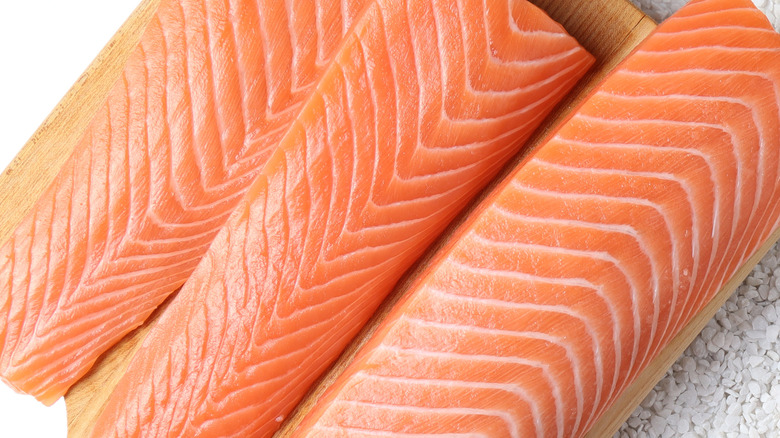 It's generally recommended to buy farm-raised salmon to consume raw since wild-caught is at a higher risk for parasites. And, as mentioned above, double-check that the fish has been previously frozen. If you want to ensure further safety and quality, look for labels like "sushi-grade," "sashimi-grade," or "for raw consumption" — while these labels don't technically have any legal guidelines, they do mean that the seller has deemed the salmon safe to eat raw, which typically means it's been deep-frozen to kill any potential contaminants.