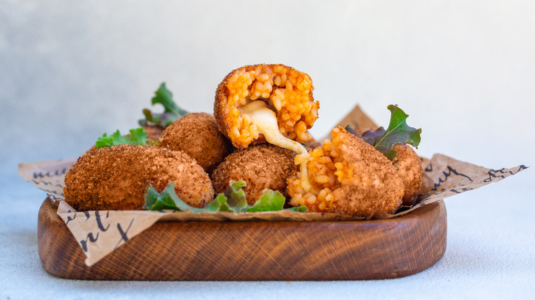 If you want a crowd-pleasing passed appetizer that doesn't cost a fortune, jump on the arancini bandwagon. This classic Italian recipe of stuffed rice balls gets its name from resembling "little oranges", though it tastes nothing like the citrus fruit. After the frying process, they turn into mini copper-toned basketballs of bliss.
