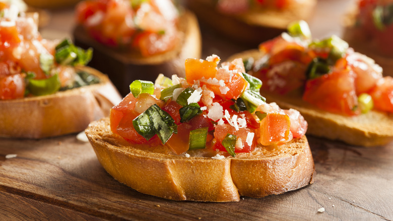 Bruschetta roughly translates from Italian into English as "roast over coals" and while that may be the ideal way to get your bread toasty and add an extra layer of smoky flavor, an oven or gas grill are fine substitutes. Bruschetta is a customizable passed appetizer with a multitude of options when it comes to ingredients and flavors.