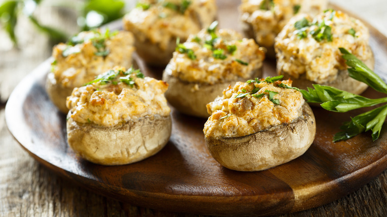 Stuffed mushrooms are a one-bite wonder. Starting with the shrooms themselves, they're high in protein, vitamin B, and iron (via Livestrong.com). As for flavor, the gentle earthy notes accompanied by their chewy texture make them an excellent foundation for any number of ingredients. You can go completely vegetarian and stuff the mushrooms with artichoke hearts and Parmesan cheese. Or, cater to the carnivores and fill them with chorizo and ham.